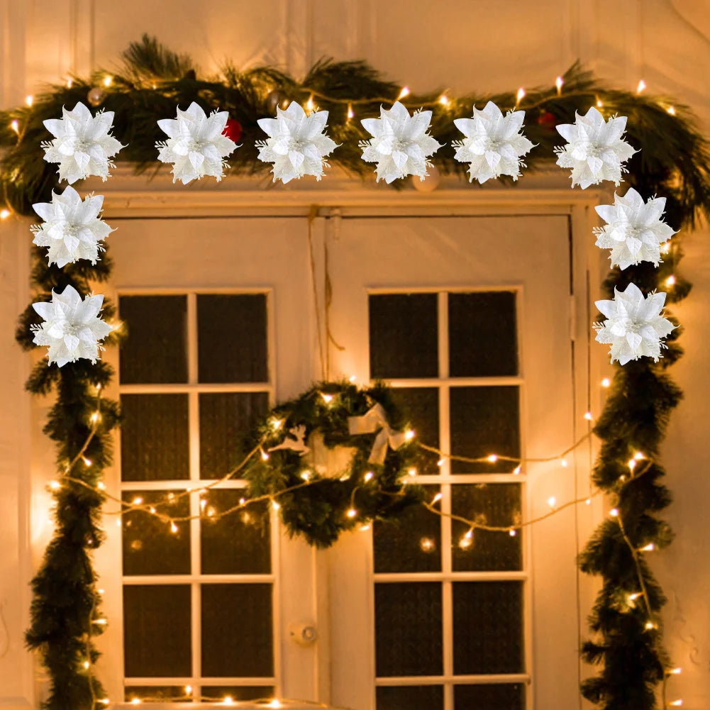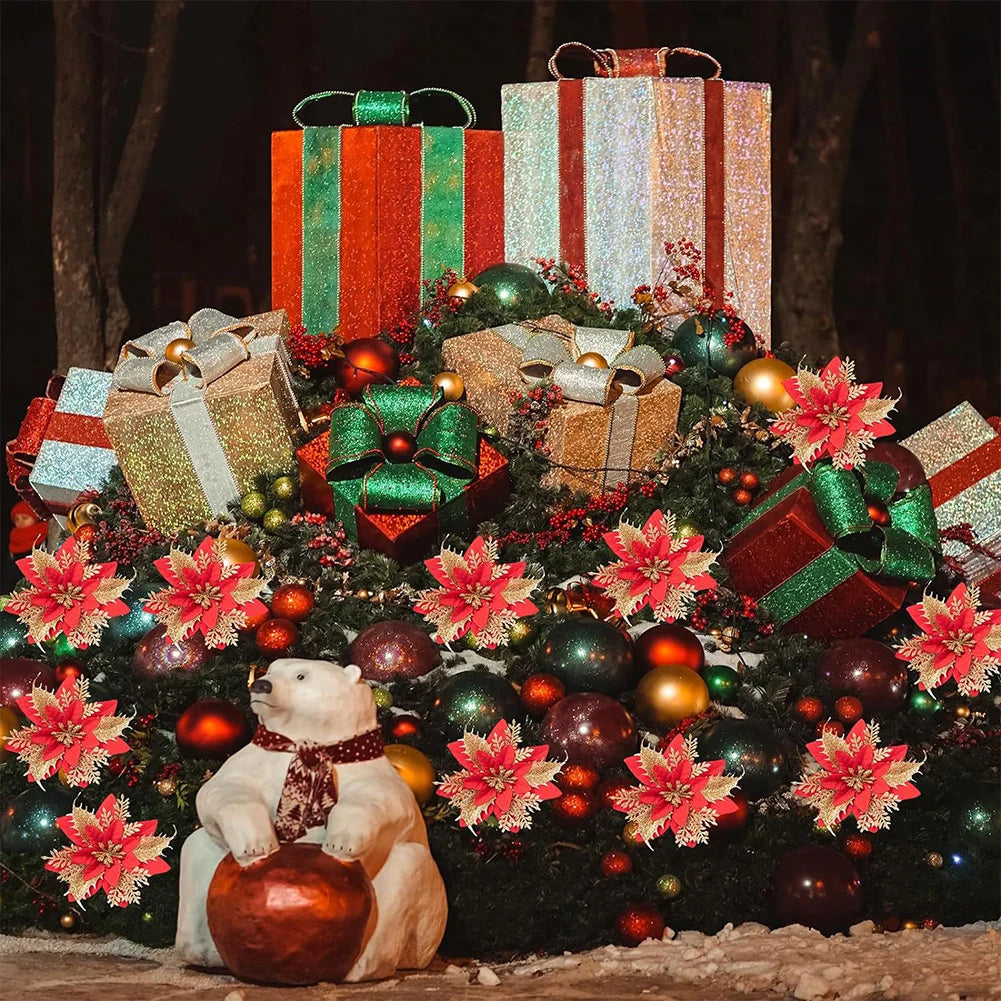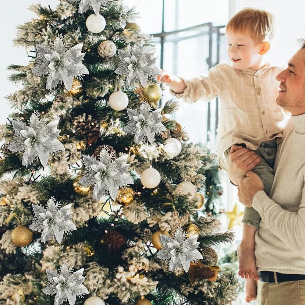 Add elegance to your Christmas décor with these glittering poinsettia flowers. Perfect for trees, wreaths, stairs, and windows, they bring festive sparkle and charm.